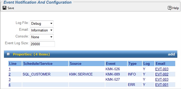Click the Add button in the line item section command bar to add a new Property. See help for Event Log Notification Line Item for form information.
