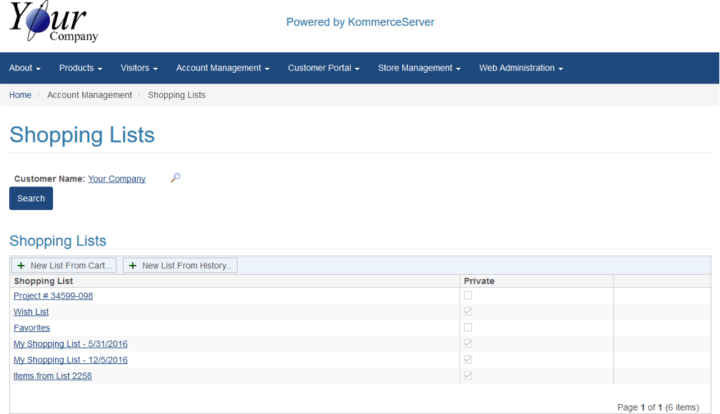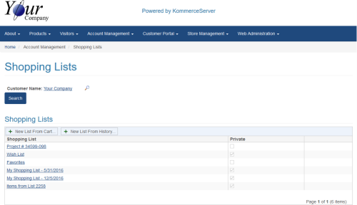 Shopping ListsKommerceServer provides the ability to allow your customers to create shopping lists of desired products that is saved to their user account, enabling them to signify interest without immediate intent to purchase. Offering your customers shopping lists serves as an effective way to reduce shopping cart abandonment and fulfill sales from customers who showed intent but didn't end up purchasing. Shopping lists are mutually beneficial as they give customers an easy way to remind themselves of a product they are interested in and it helps merchants measure product interest beyond a clear-cut sale. You can navigate to the Shopping Lists page by selecting Account Management>Shopping Lists. The following image shows an example of the Shopping Lists page. The main Shopping Lists page allows you to search for a shopping list by company, view existing shopping lists, create a new shopping list from items in your shopping cart, and create a new list from items in your purchase history. Click the link of an existing shopping lists in the Shopping Lists area to view that list. Click the New List From Cart... button to create a new list from items in your shopping cart. Click the New List From History... button to create a new list from your purchase history. |