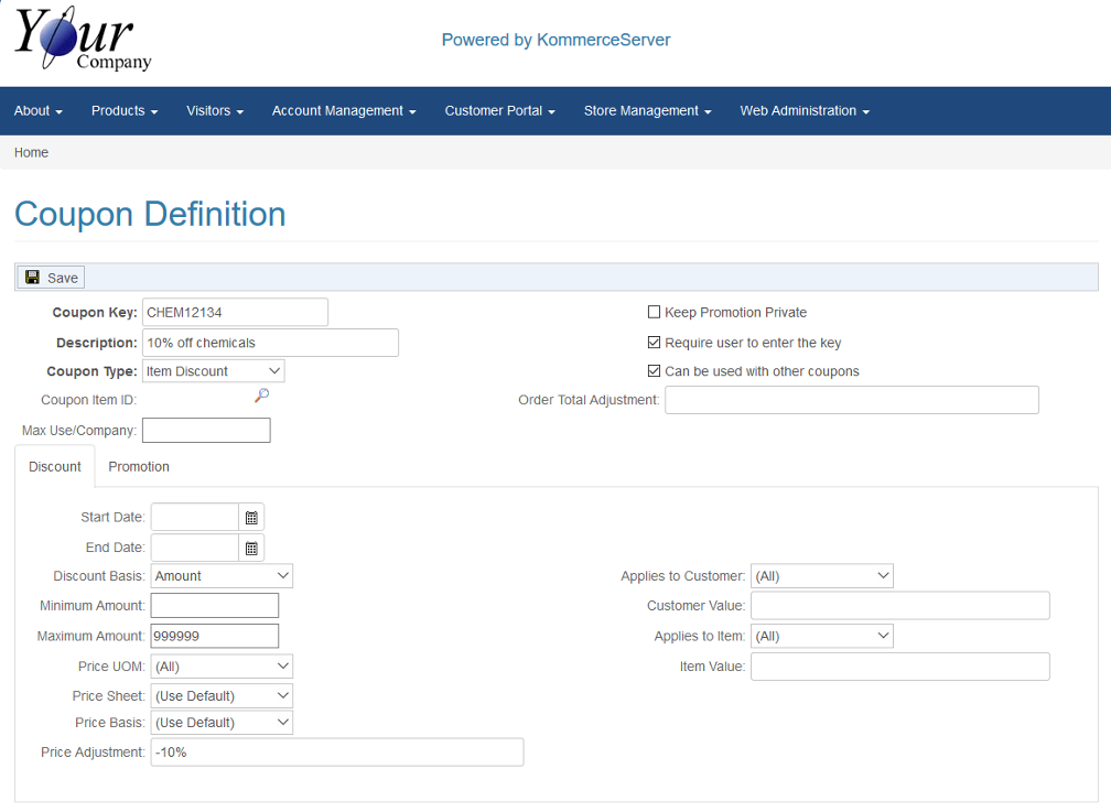 This will be the item ID that will be added to the cart and order if this coupon is redeemed. This special item will need to be recognized by your back office ERP system when the order is imported. You can select the item if it exists in the ERP system and has been sent to KommerceServer through its inbound API. If no coupon item ID is specified, the Coupon Key value will be sent.