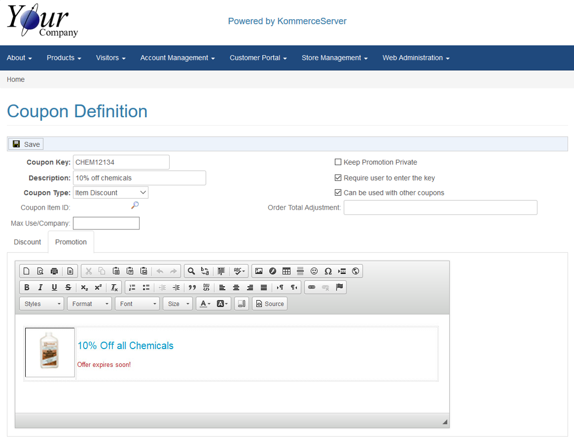 Enter the promotion content that describes the coupon or promotion to the customers. This content will be shown to the web customers while browsing the store. It is recommended that you include any rules or restrictions such as expiration dates and minimum order amounts in your promotion content as it may help entice web customers to buy now or buy more to qualify for the promotion.