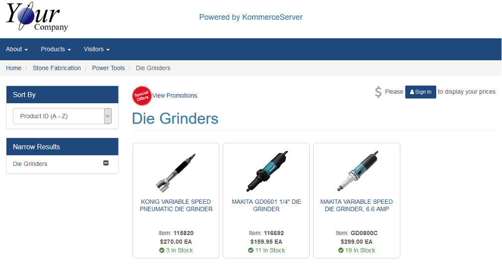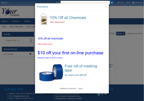 Coupon Functionality & WorkflowCoupons in KommerceServer’s storefront can optionally be self-promoting so the customer can be made aware of any specials and promotions while customers are browsing the website. If a customer browses to a listing of products where coupons may qualify, the coupon control becomes visible in the landing page for that product listing. Users can click the “View Promotions” link to see the relevant coupons that may apply based on the products they are viewing. The following image displays an example of the “View Promotions” link. The following image displays an example of the “View Promotions” link on a shopping page. The following image displays an example of the “View Promotions” pop-up window as it appears on a shopping page. This pop-up window will display the available coupons that are defined as non-private only and relevant to the products being viewed. The pop-up can only be dismissed as redeeming the coupon can only be done during checkout. |