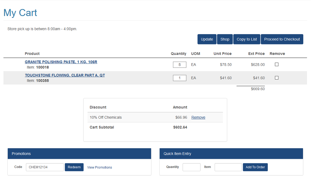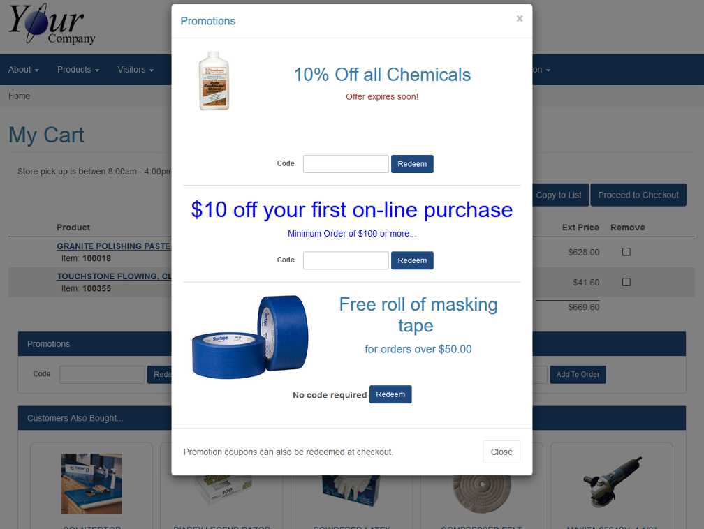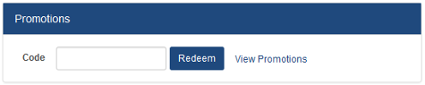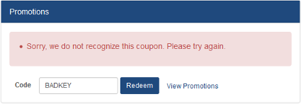 Coupon RedemptionThe coupon redemption dialog box appears on the Shopping Cart page. The following image displays an example of the Coupon Redemption dialog box. Web customers can enter known coupon keys for redemption or click the “View Promotions” link to see the non-private promotional coupons that may apply. The following image displays an example of the pop-up window that appears when you click the “View Promotions” link on the Shopping Cart page. This pop-up window will only show those coupons that are relevant to what the web customer has in their cart. At this point, a user can redeem the coupon by entering the proper coupon key for the corresponding promotion. If the user enters an invalid coupon key or the coupon is not valid for some reason, an error message is displayed to the web customer within the coupon redemption control dialog box. The following image displays an example of an error message that displays when a customer enters a wrong coupon code. Possible error responses include: