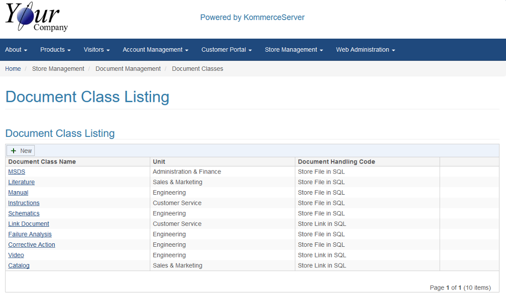 Document Class Listing PageThe Document Class listing page allows you to view the list of document classes that have been created for your KommerceServer website. You can navigate to the Document Class Listing page by selecting Store Management>Document Management>Document Classes. The following image shows an example of the Document Class Listing page. Click the New button to create a new document class definition. Click the link for a document class in the Document Class Name column to view, modify or delete an existing document class. |