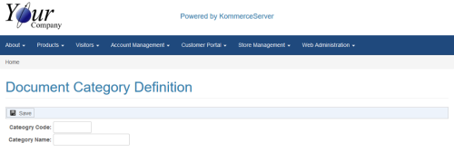 Document Category Definition PageThe Document Category Definition page allows you to define document categories for the documents you post to your KommerceServer system. Document categories are useful for organizing documents around a common theme such as a particular product line or industry served (electrical, plumbing, etc.). You can navigate to the Document Category Definition page by selecting Store Management>Document Management>Categories. Following is an example of the Document Category Definition page. Creating a New Document Category DefinitionPerform the following steps to create a new document category definition.